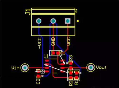 我讓實(shí)習(xí)生為設(shè)計(jì)做布板,同時(shí)給了他關(guān)于PCB布局的一般指導(dǎo)(例如:盡量減少電路板的走線路徑,盡量保持元件排列緊密,以減少電路板占用空間) )空間),然后讓他自己設(shè)計(jì)。設(shè)計(jì)過(guò)程有多難?其實(shí)就是幾個(gè)電阻電容而已,不是嗎?圖2顯示了他最初嘗試設(shè)計(jì)的布局。紅線是到板子頂部的路徑,藍(lán)線是底部路徑。
