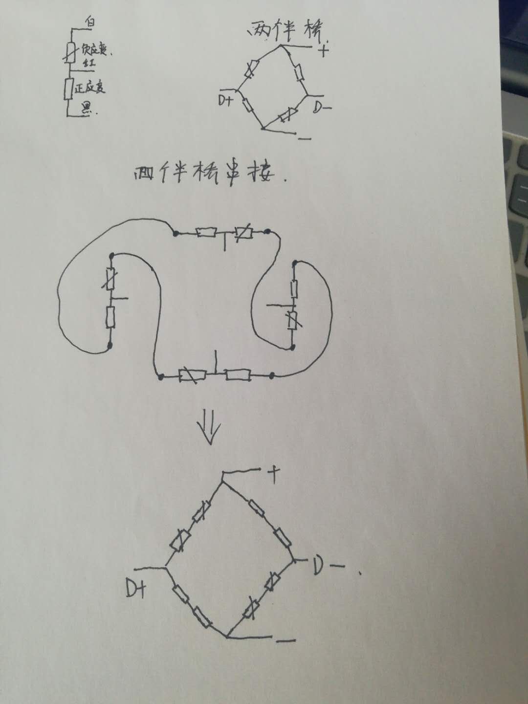 現(xiàn)在需要將四個半橋稱重傳感器串接在一起,我們要注意接法。其原理是將負(fù)應(yīng)變電阻兩個接在一起,正應(yīng)變電阻兩個接在一起,剛好有4組電阻:兩組正應(yīng)變、兩組負(fù)應(yīng)變,可以組成一個全橋。如下圖是我手繪的全橋稱重傳感器接法:
