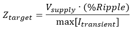 注意,在上式中,波紋百分比表示為峰峰值,而不是波紋幅度。這是因?yàn)榧y波不是純粹的正弦波,因此就振幅而言寫紋波沒有多大意義。上式的一種形式使用紋波幅度(假設(shè)正弦紋波波形),并且分母中放置了50%的因數(shù)。注意,用兩個(gè)方程式計(jì)算的目標(biāo)阻抗值相等。