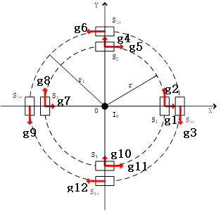 圖中紅色箭頭代表傳感器軸方向,內(nèi)圈4個雙軸HMC1022芯片,外圈4個HMC1021芯片。