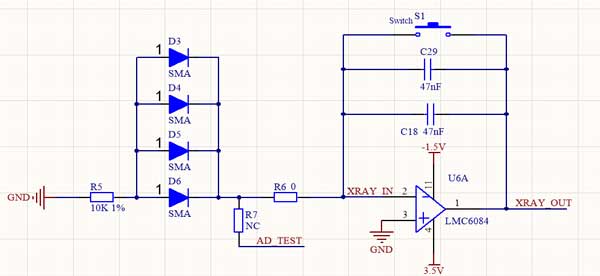 本測試電路的核心是積分電路:X射線照射D6二極管,會產(chǎn)生光升暗電流,是積分電路C29兩端的電壓上升快。測量C29電容端的電壓就可得知x射線劑量。